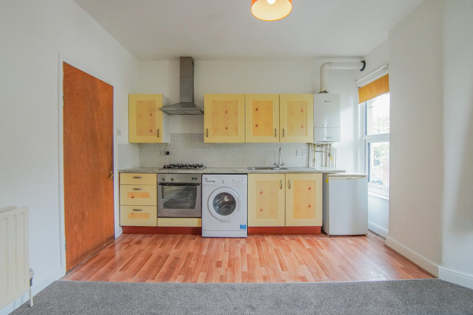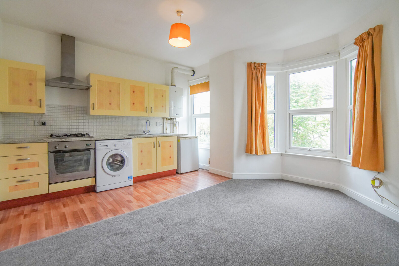 The flat has an open plan kitchen/living room with an undercounter fridge, washing machine, gas hob and electric oven and large bay windows that allow a lot of light in to the room, a double bedroom which has been recently decorated and shower room.