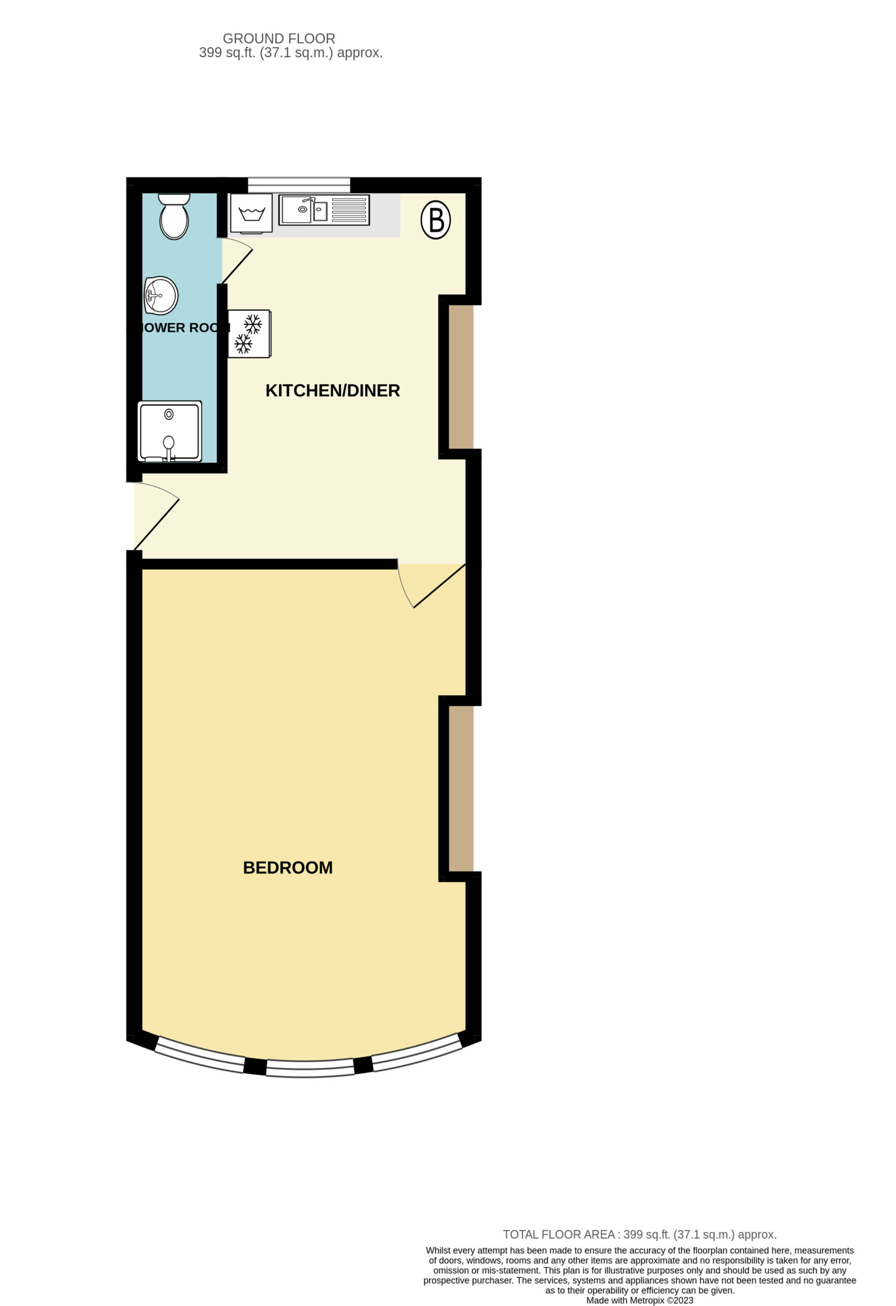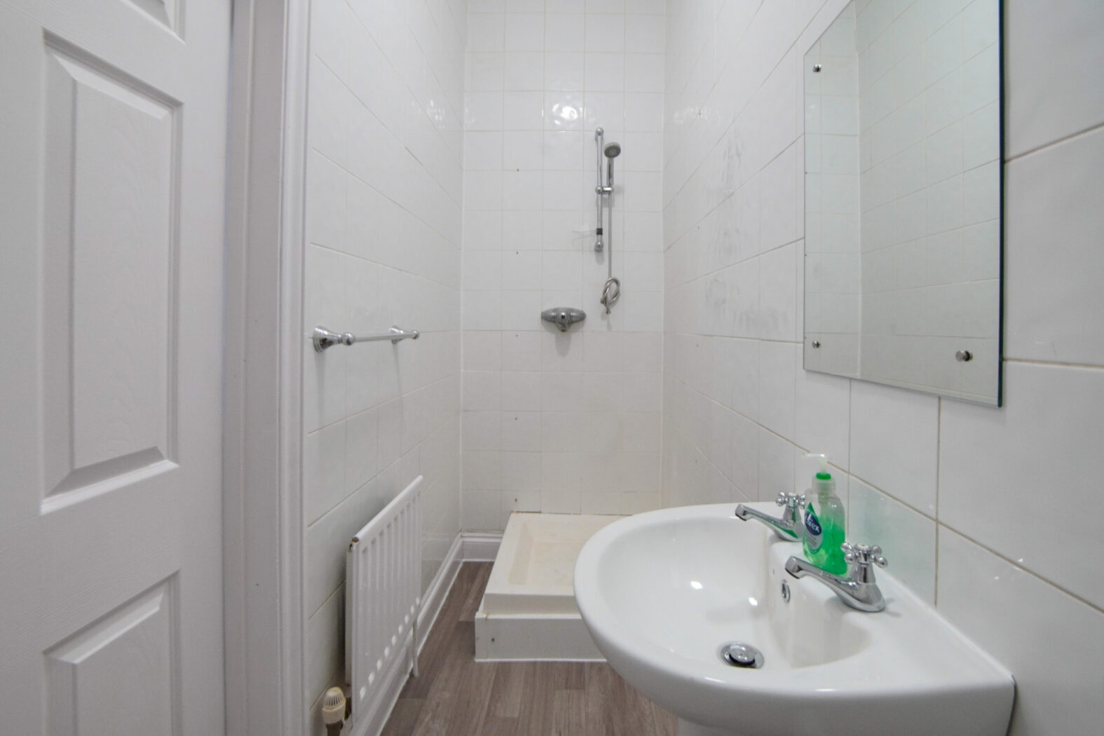 The kitchen/living space has cupboards and appliances, there is one big double bedroom, with large bay windows, and lastly a bathroom with a shower.