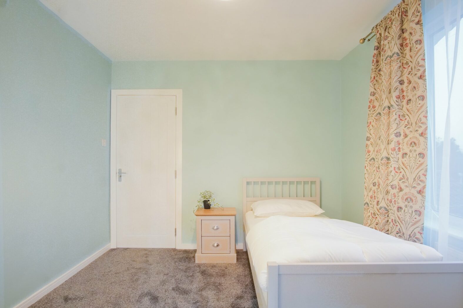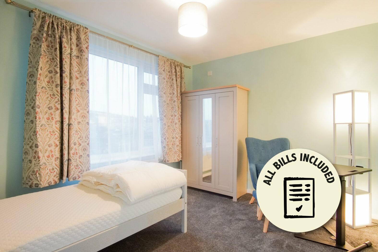 The bedroom available is one of four, all with single professional tenants in situ. The bedroom available is a large double bedroom on the first floor to the rear of the property. The room is offered furnished with armchair, wardrobe, desk and single bed.