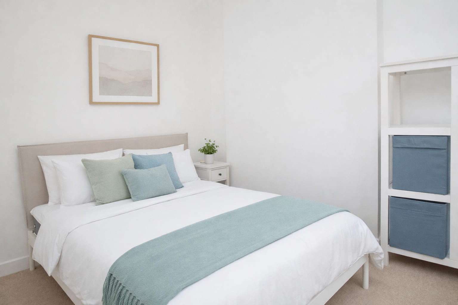 The apartment offers a large open plan lounge/ dining / kitchen furnished with a sofa, armchair, tv unit with tv and dining table with four chairs. The kitchen has an integrated under counter fridge, and slimline dishwasher as well as a microwave. The first double bedroom has a large window to allow plenty of natural light, and is furnished with a double base, headboard, mattress and mattress protector, including a shelving/ hanging unit and bedside table. Down the passage is a utility cupboard with a washer/ dryer and freezer.