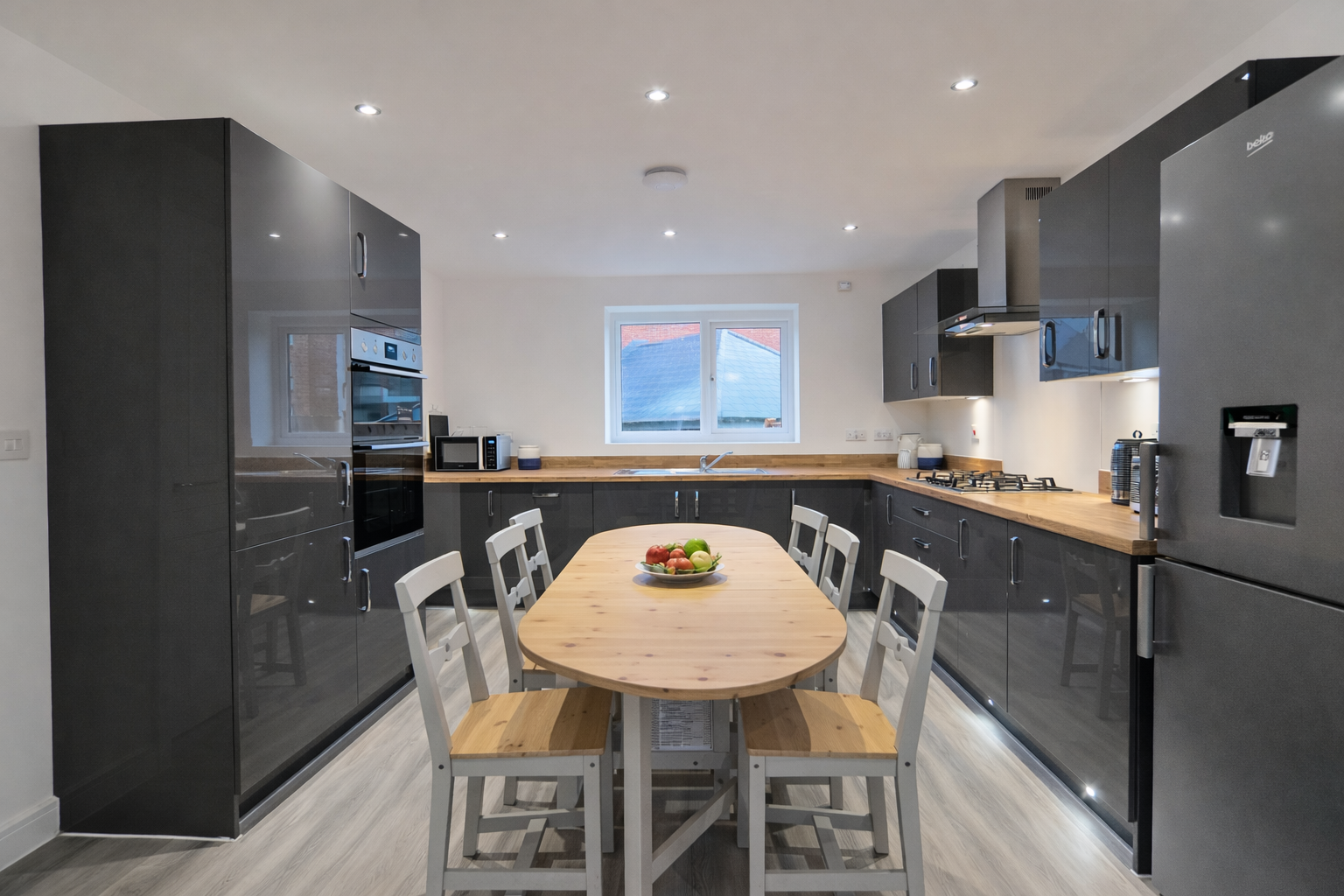 The accommodation briefly comprises; a bright open plan kitchen/ living /diner with a beautiful top of the range fitted kitchen which offers plenty of cupboard space, integrated high specification white goods and appliances, LED counter lighting and spot lighting. The room is furnished with a dining table, chairs and will have a smart sofa and a coffee table in place within the lounge area. There are six double bedrooms across two floors, all of which are good sized double rooms. They are furnished accordingly with a double bed, mattress, desk, chair and wardrobe whilst the master bedroom benefits from having a luxury en-suite shower room. The main bathroom has smart contemporary tiling and a white suite in place with a shower above the bath. There is an additional downstairs shower room, with shower cubicle, toilet and sink. To the rear of the property is sunny spacious garden, which has both patio and lawn in place and can be accessed via the utility room or from one of the bedrooms. There is also a bike shelter in the back garden with secure locking anchors.