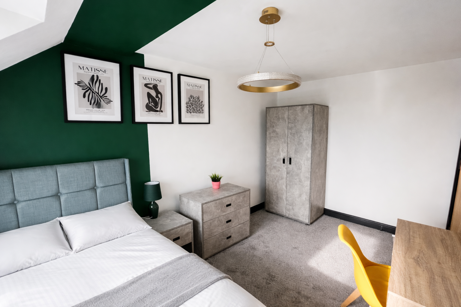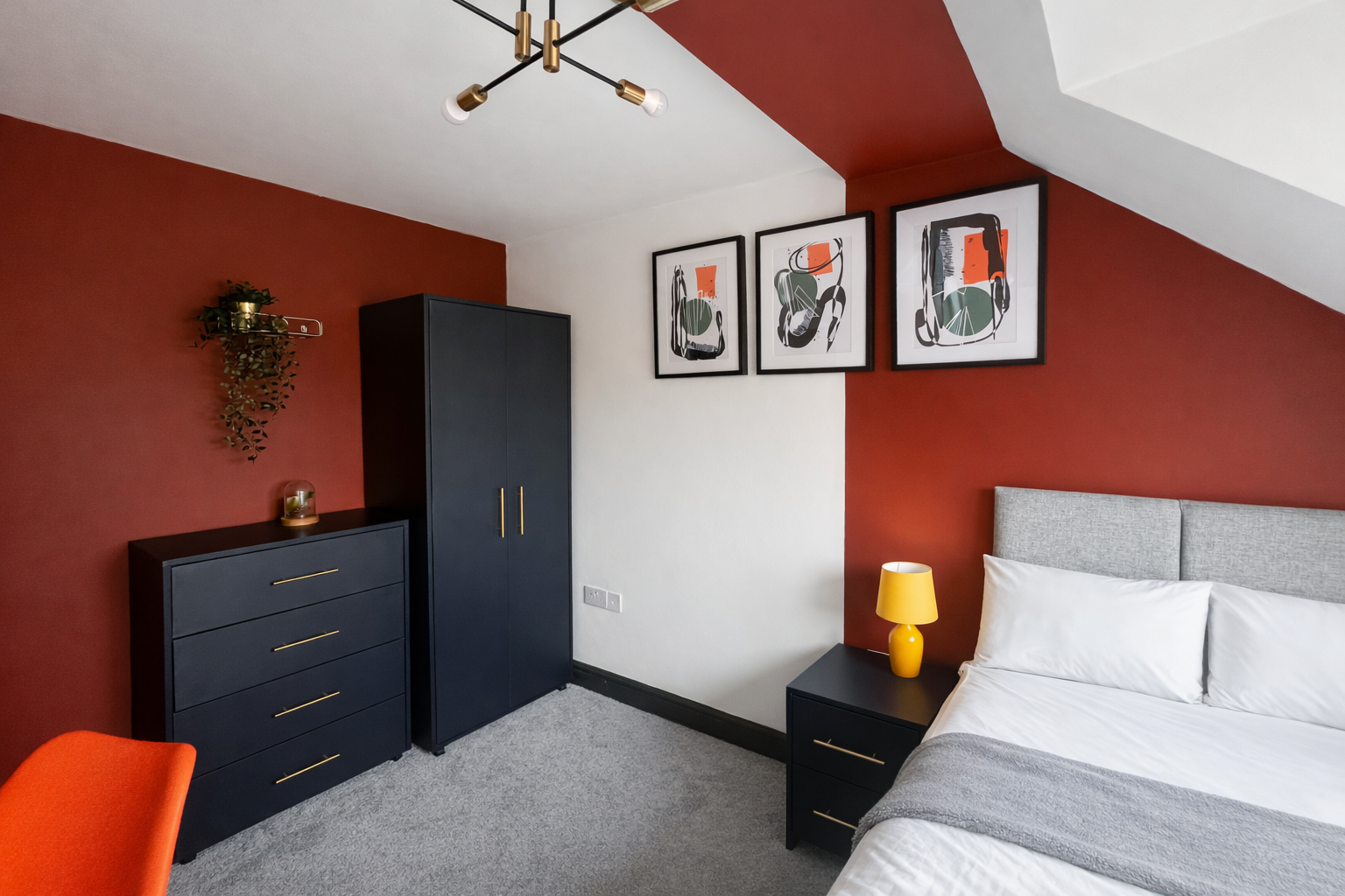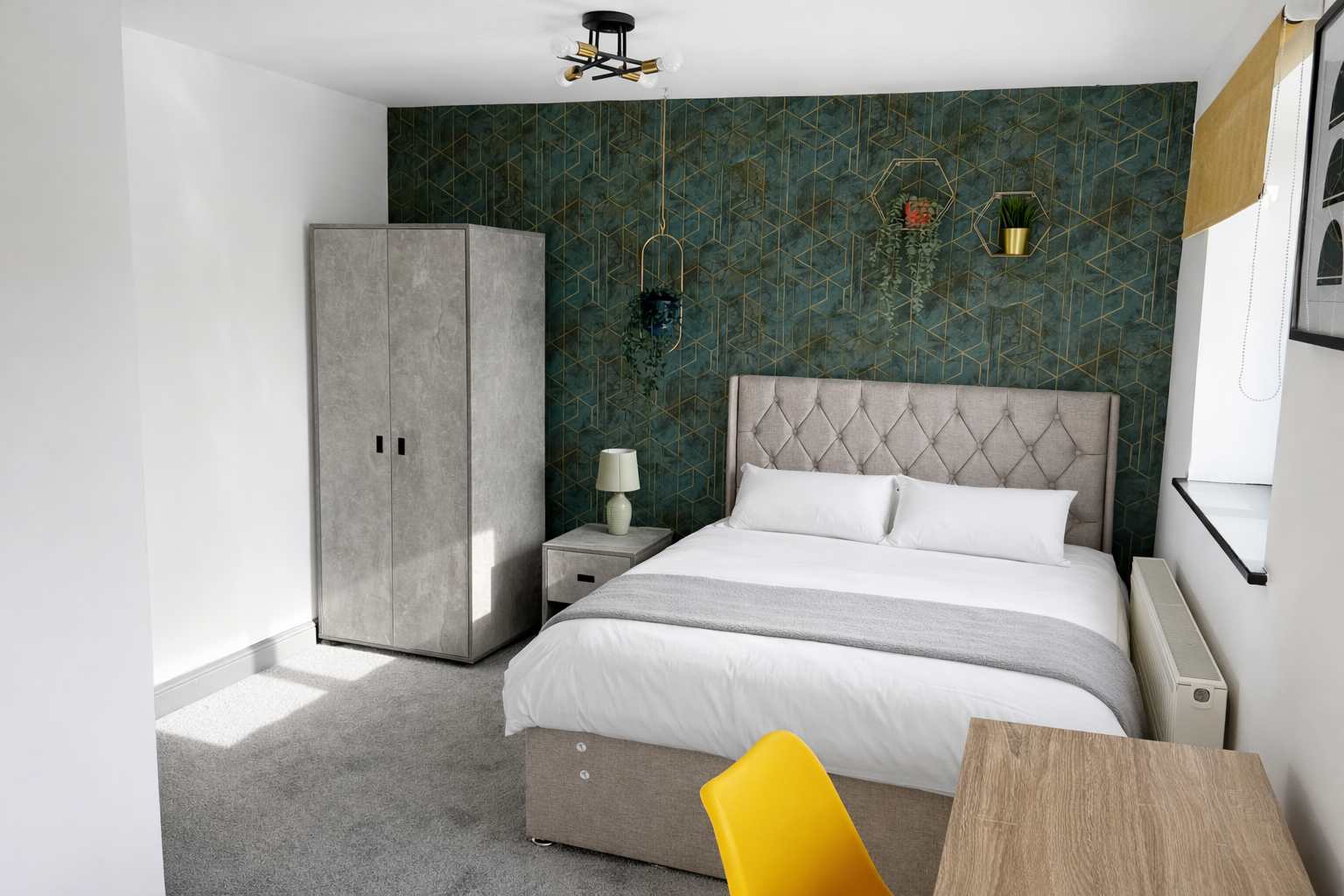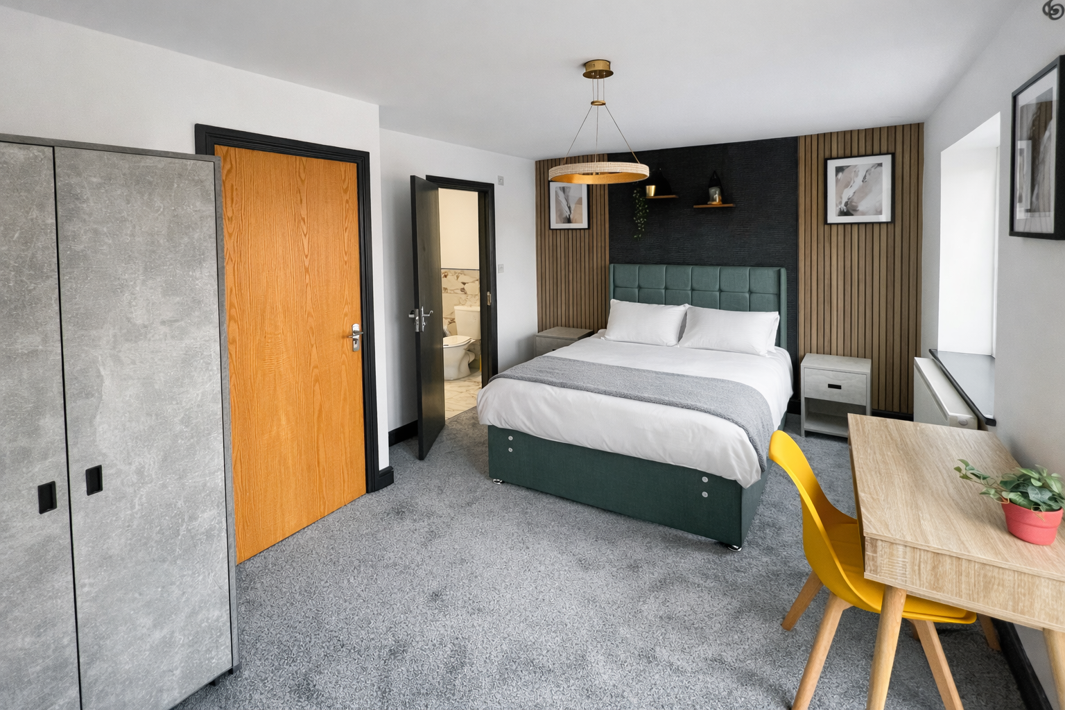 There are five double bedrooms spread across three floors, the first two en-suite rooms being on the first floor, one which features a lovely Juliette balcony, three further bedrooms on the second floor, and a spacious family bathroom with a bathtub in place and a separate shower cubicle. Each bedroom is furnished with a double bed and mattress, desk, chair, bedside table, chest of drawers, drawers, TV mounted to the walls, and wardrobe or hanging space. They are finished tastefully with a feature wall each, faux plants, new curtains, and bedside lamps.
