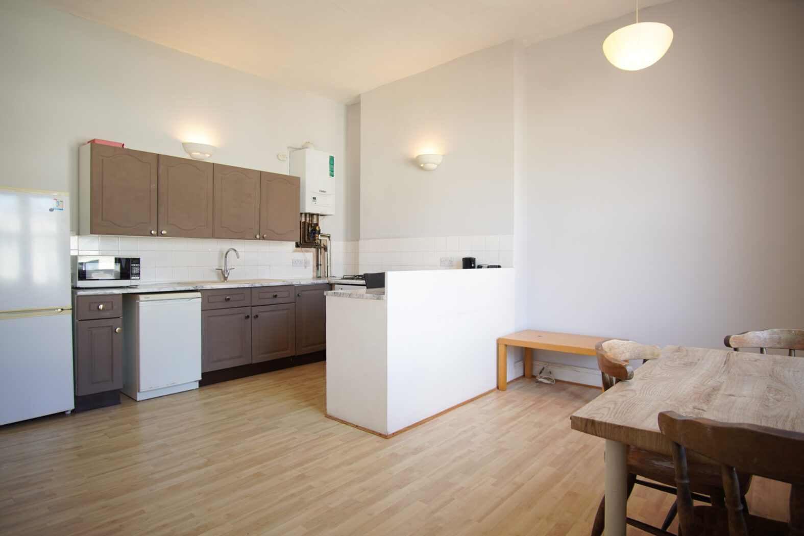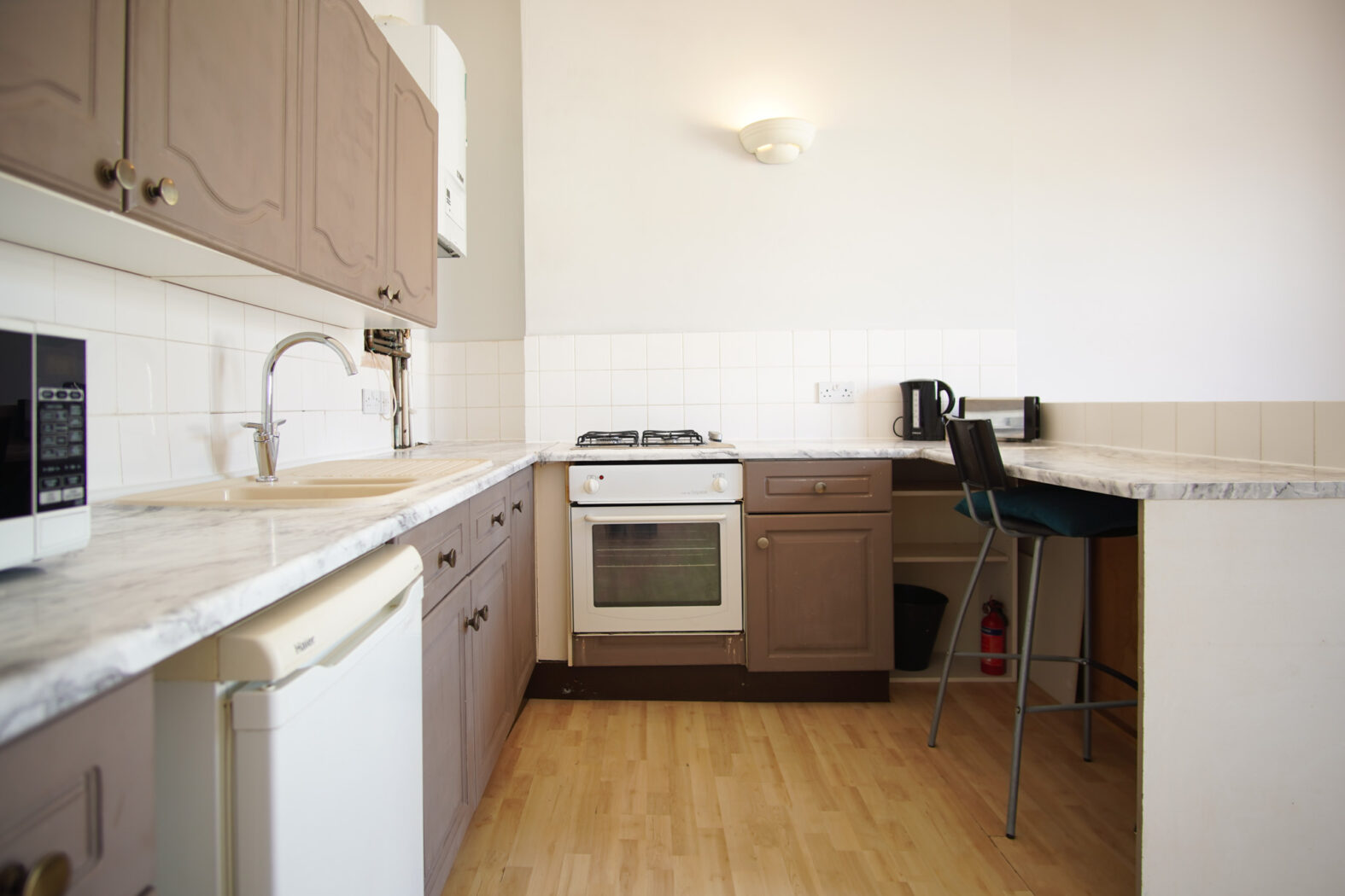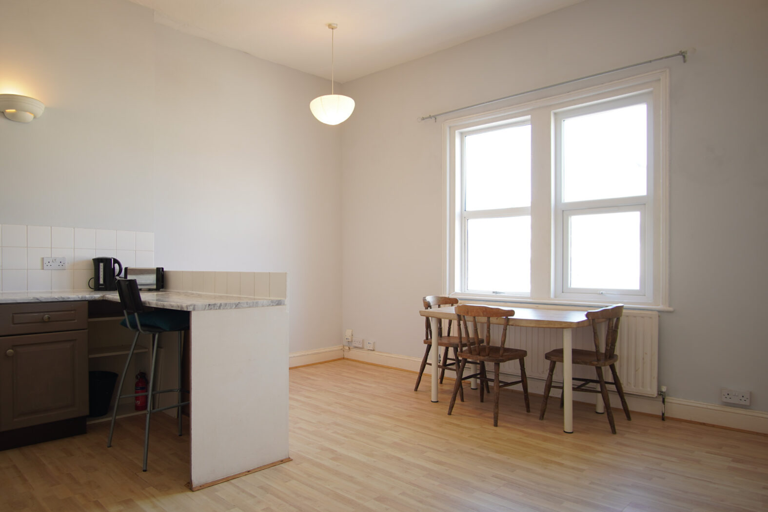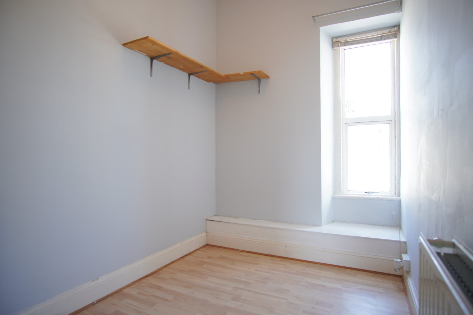 The top-floor layout offers an open plan kitchen and living area. The property features furnishings including a double bed and mattress in the first bedroom , with wardrobe and a shelving unit, the second bedroom offers a bed frame ,side table and chest of drawers. The living area includes a table with four chairs. The single bedroom best used as a study and lastly a bathroom with a shower over the bath.